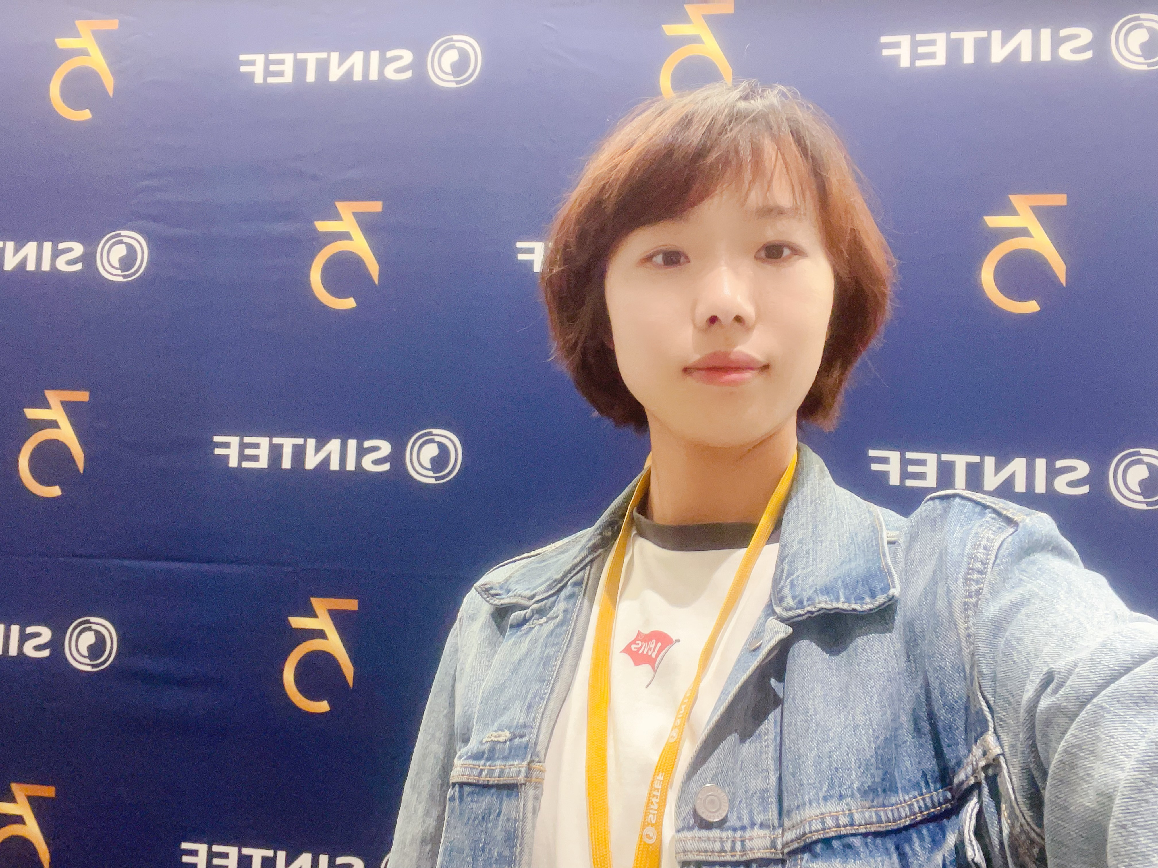 Xin Sui during SINTEF’s 75th anniversary celebration, taken in front of the commemorative poster in Oslo, Norway.