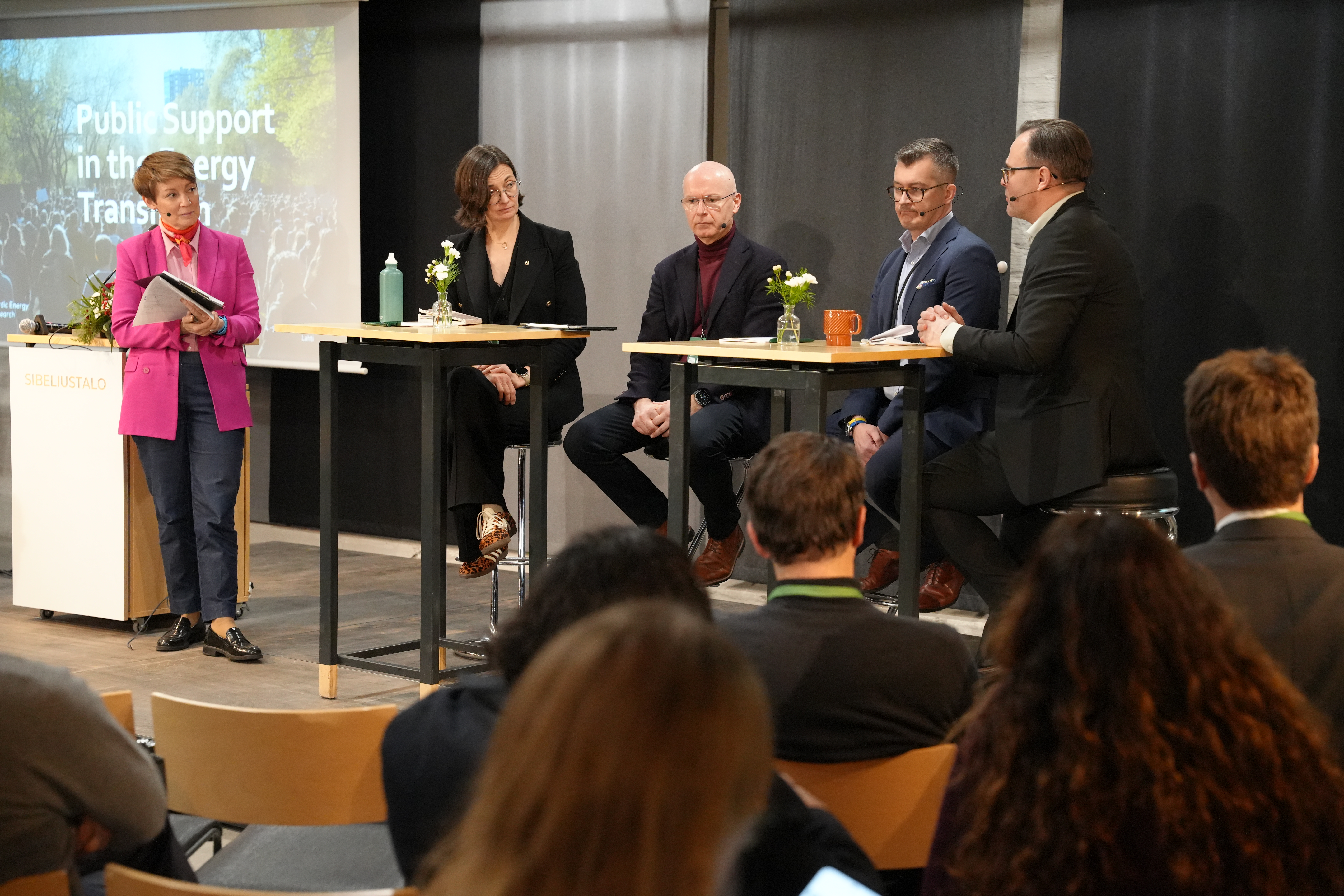Panel debate with moderator Katri Makkonen, Anni Mikkonen, CEO, Renewables Finland, Dag Inge Fjeld, Assistant Professor, Kristiania University College, Mikko Heikkilä, Head of Public Affairs and Communications, Fingrid Oyj, and Øistein Schmidt Galaaen, Director Production and Sustainability, Renewables Norway.